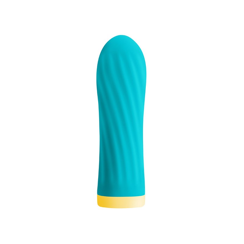 Twist & Shout es una bala vibradora de color azul que está fabricada con silicona médica. Su eje recto está rodeado de pequeñas estrías diseñadas para una mayor estimulación en zonas erógenas externas como clítoris, testículos, pezones, etc.
