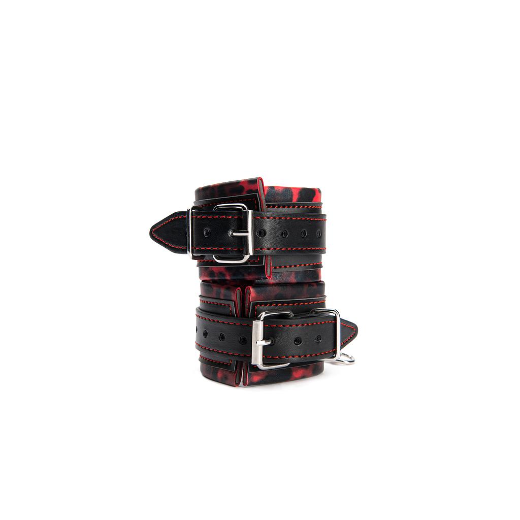 Esposas de muñeca negras con estampado de leopardo, hechos de cuero sintético.