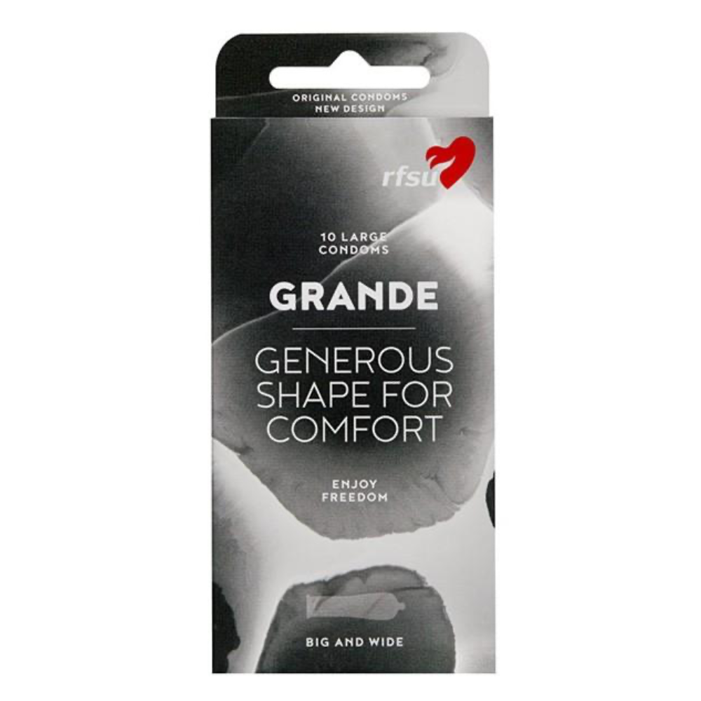 El preservativo RFSU Grande es transparente, lubricado, hecho de látex natural y con depósito.