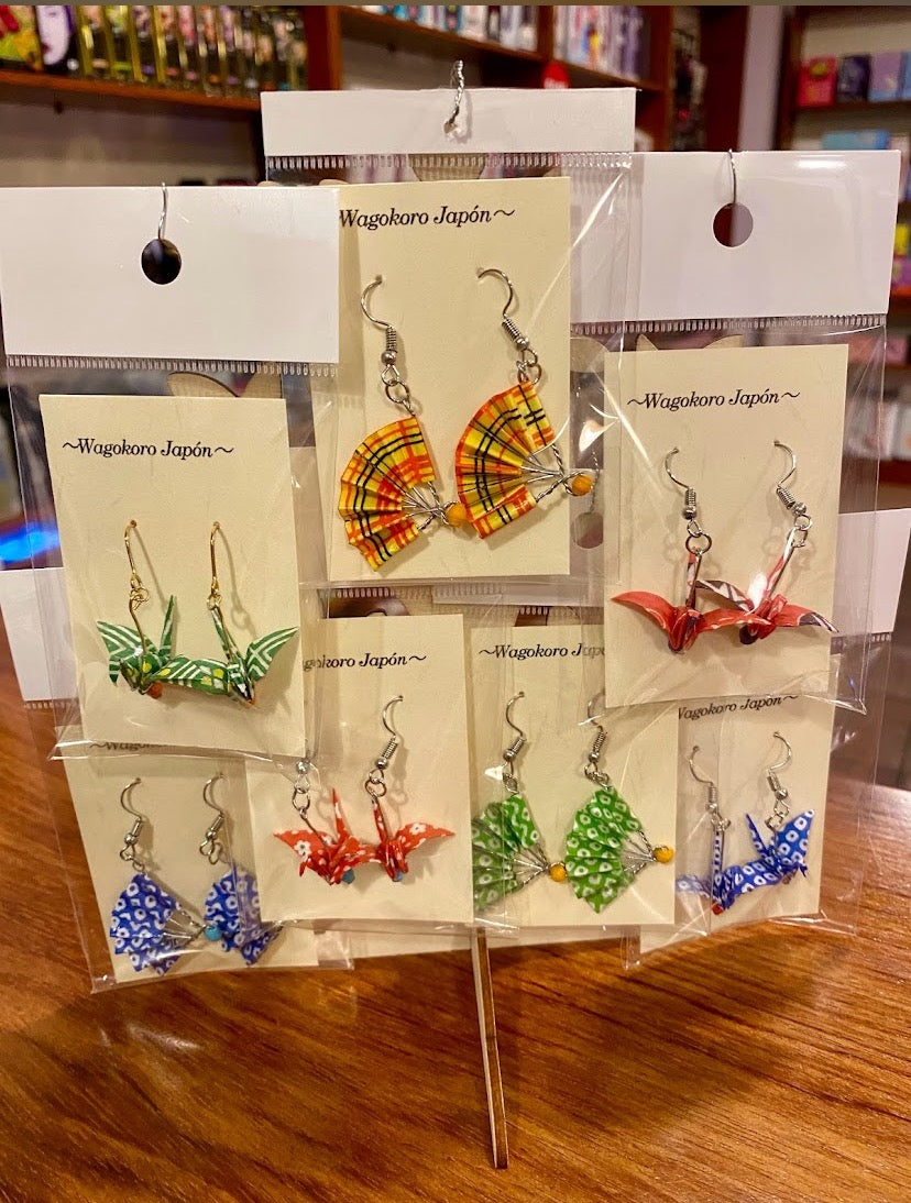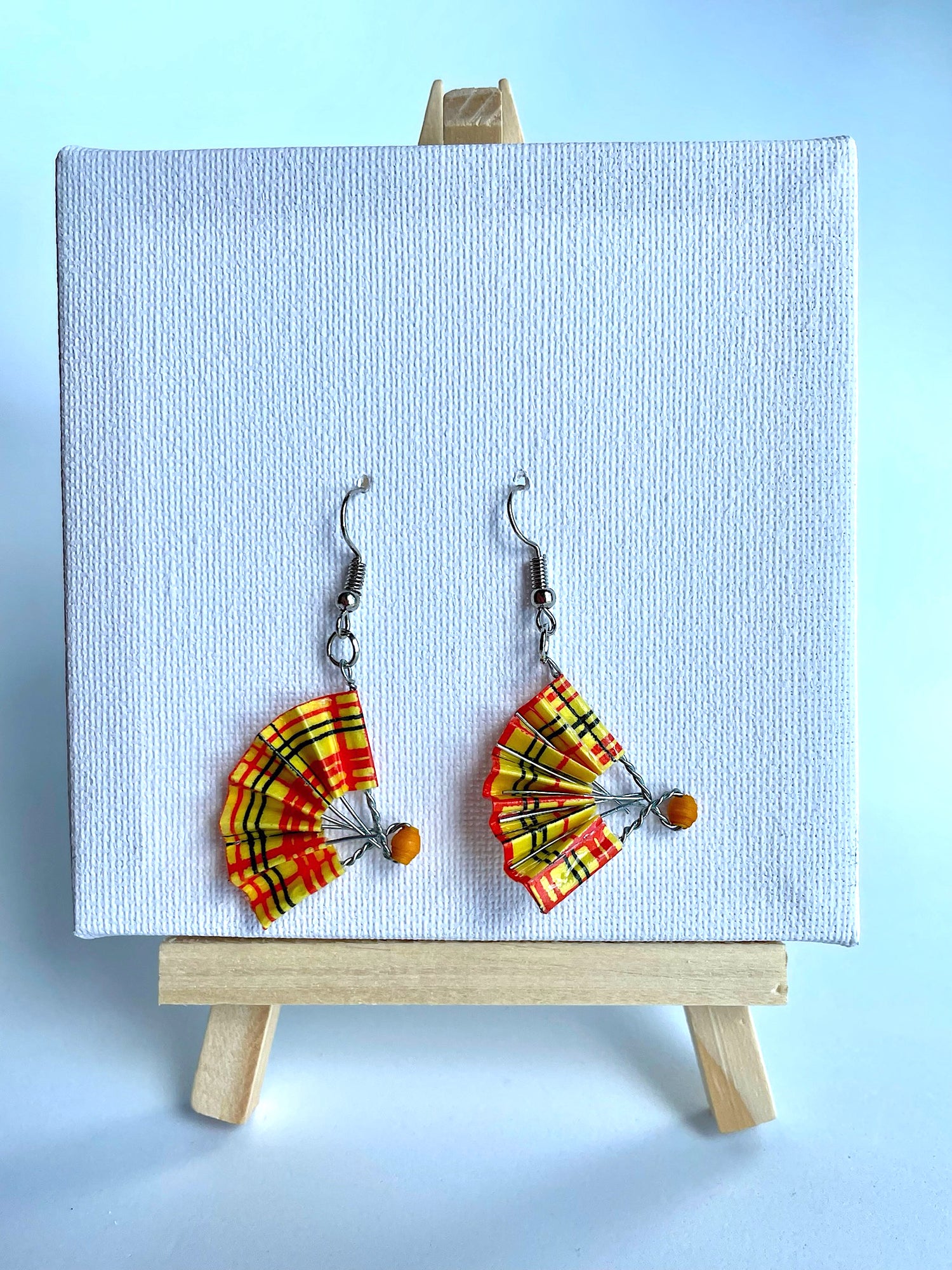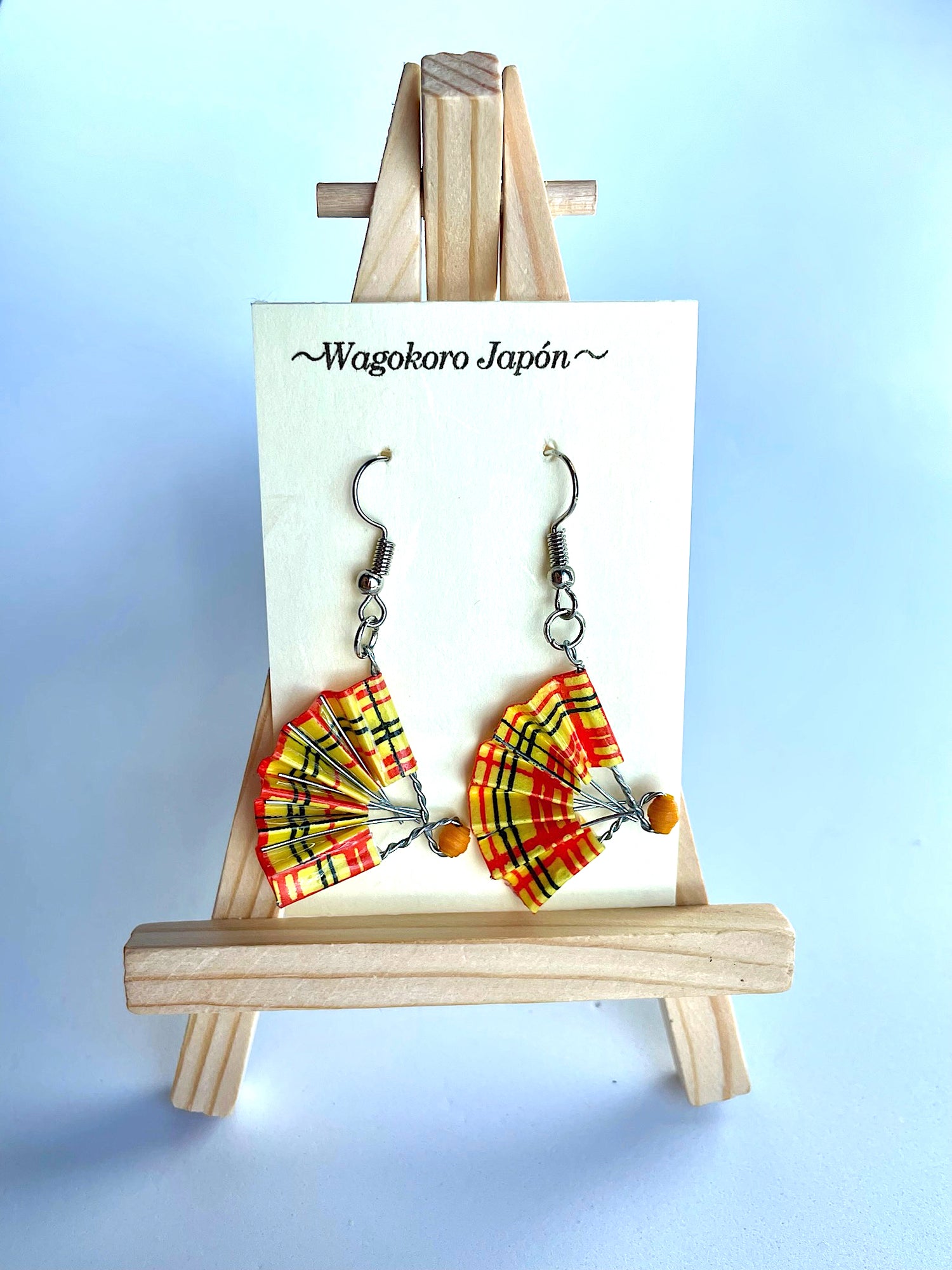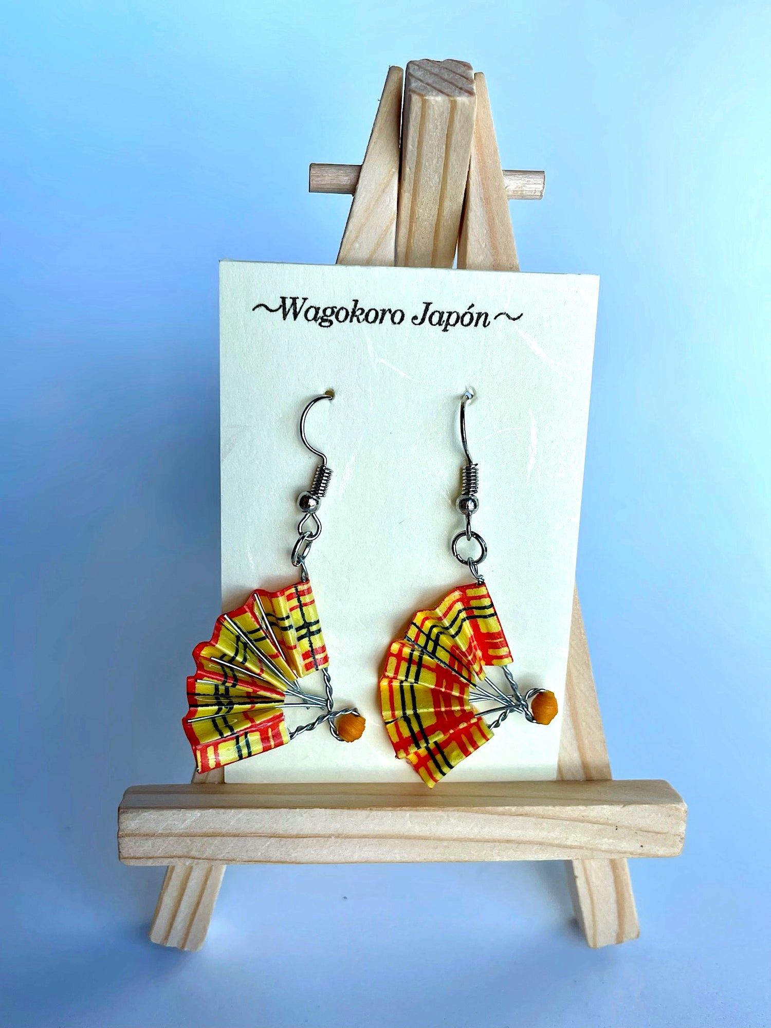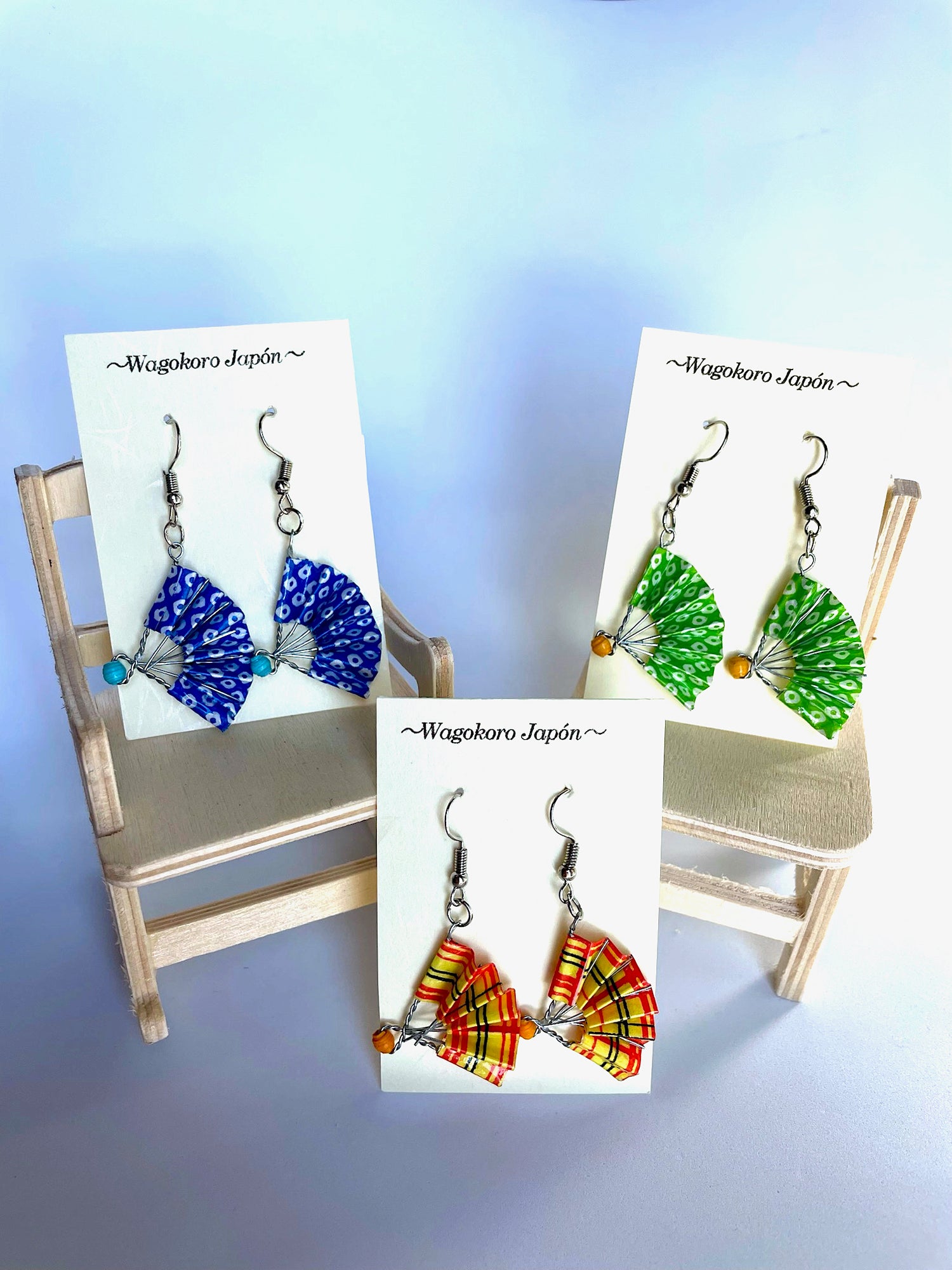 Pendientes hechos de papel japonés Origami con forma de Abanico. La obra está recubierta de un barniz y una resina para mejorar su durabilidad.