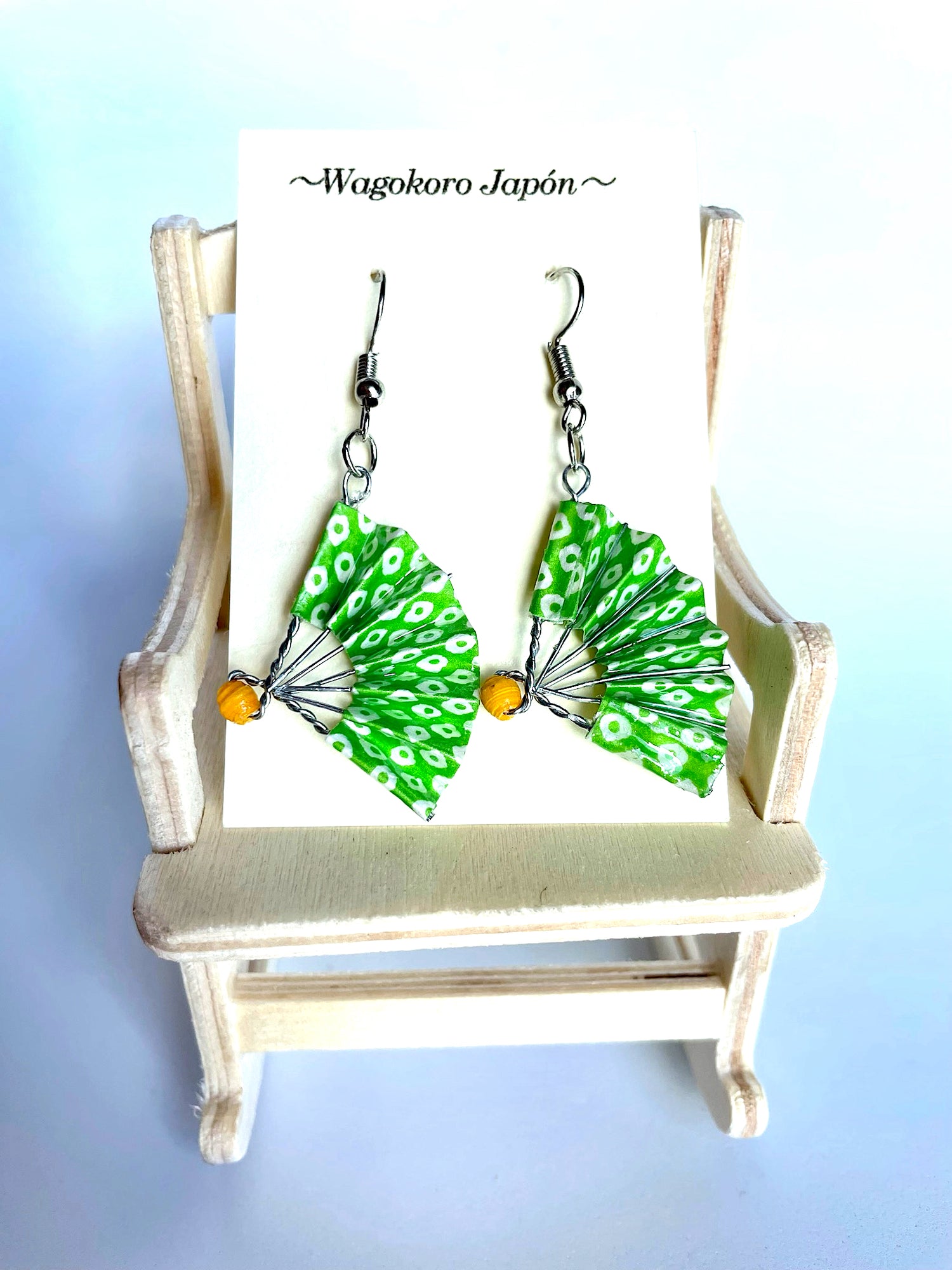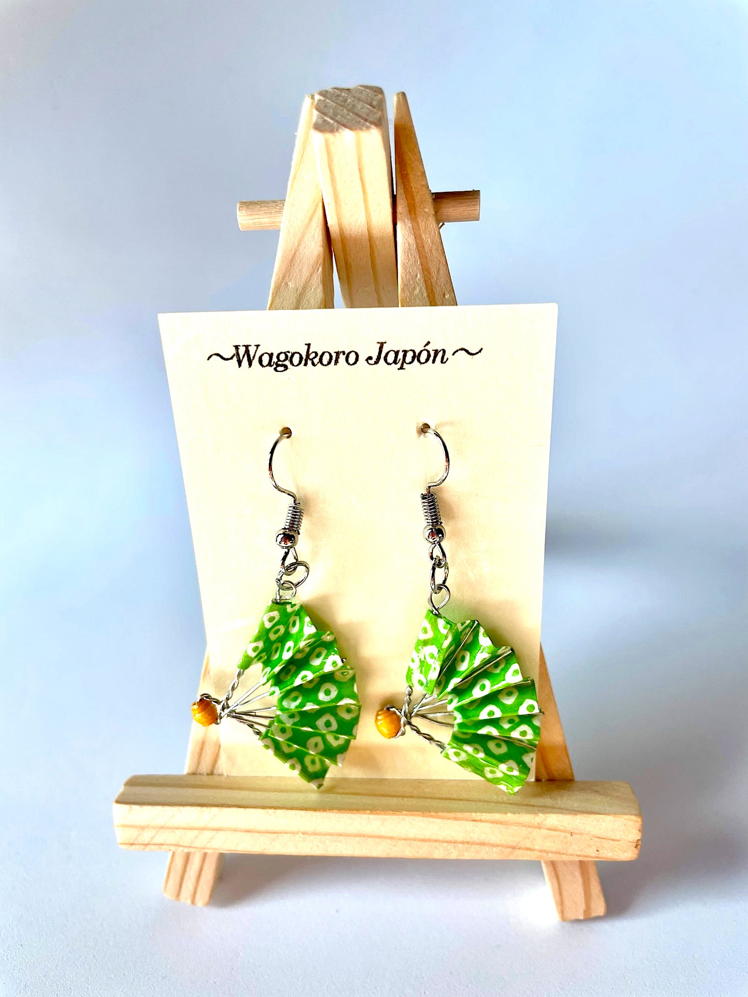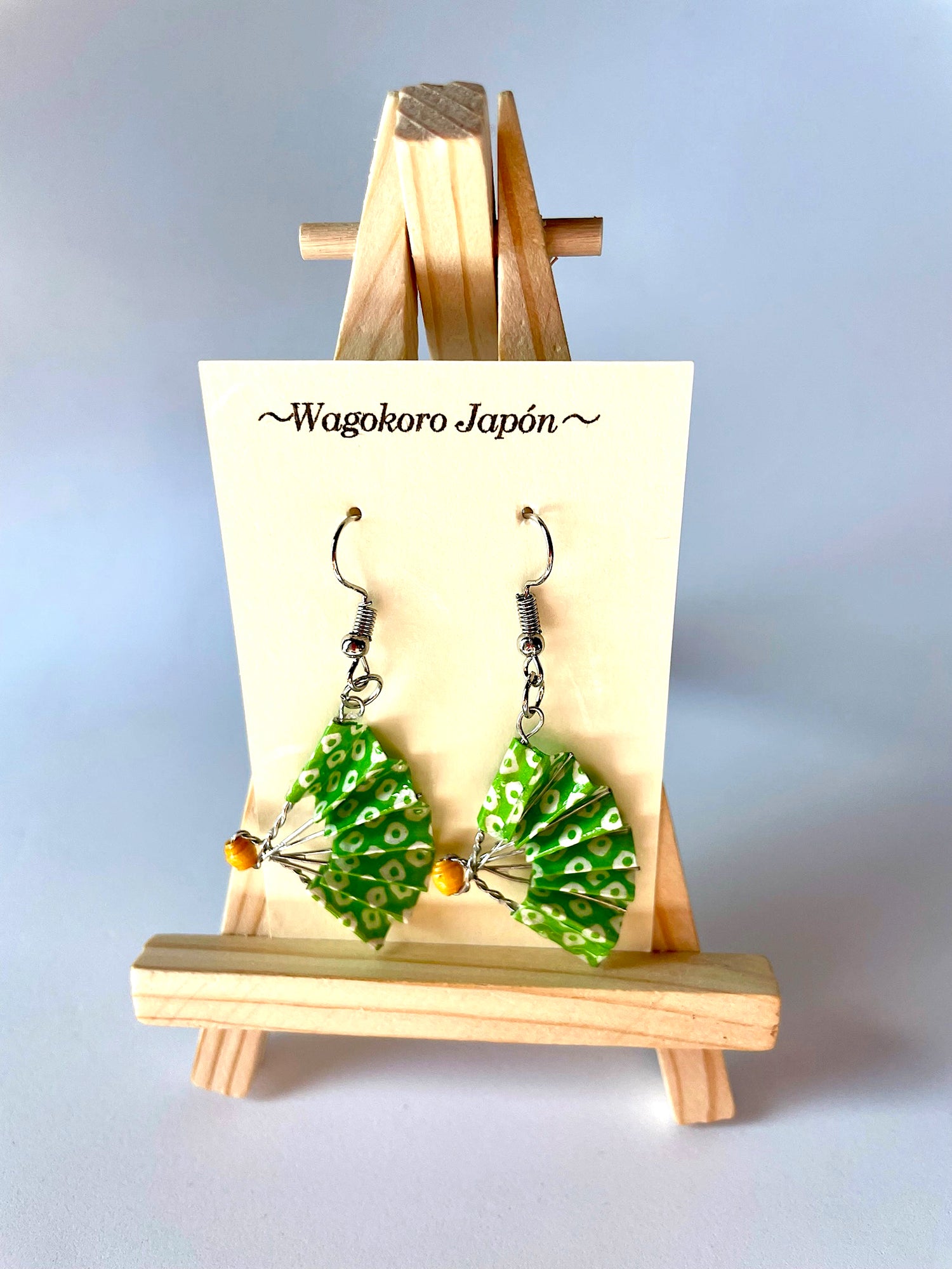 Pendientes hechos de papel japonés Origami con forma de Abanico. La obra está recubierta de un barniz y una resina para mejorar su durabilidad.