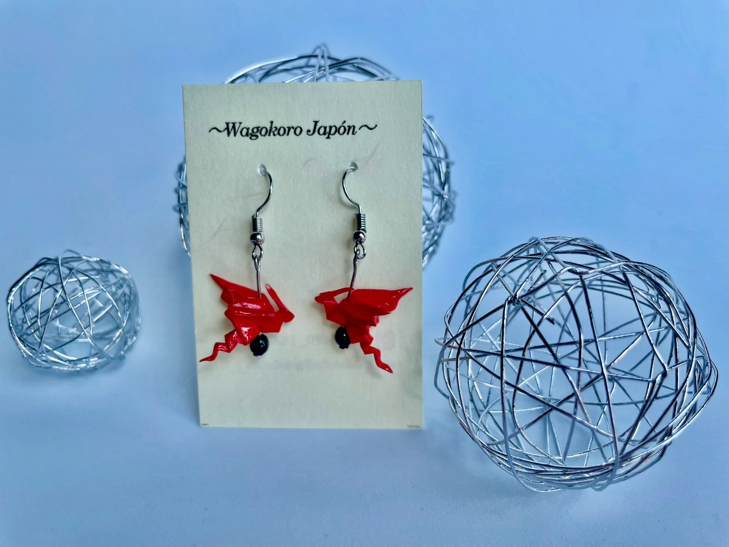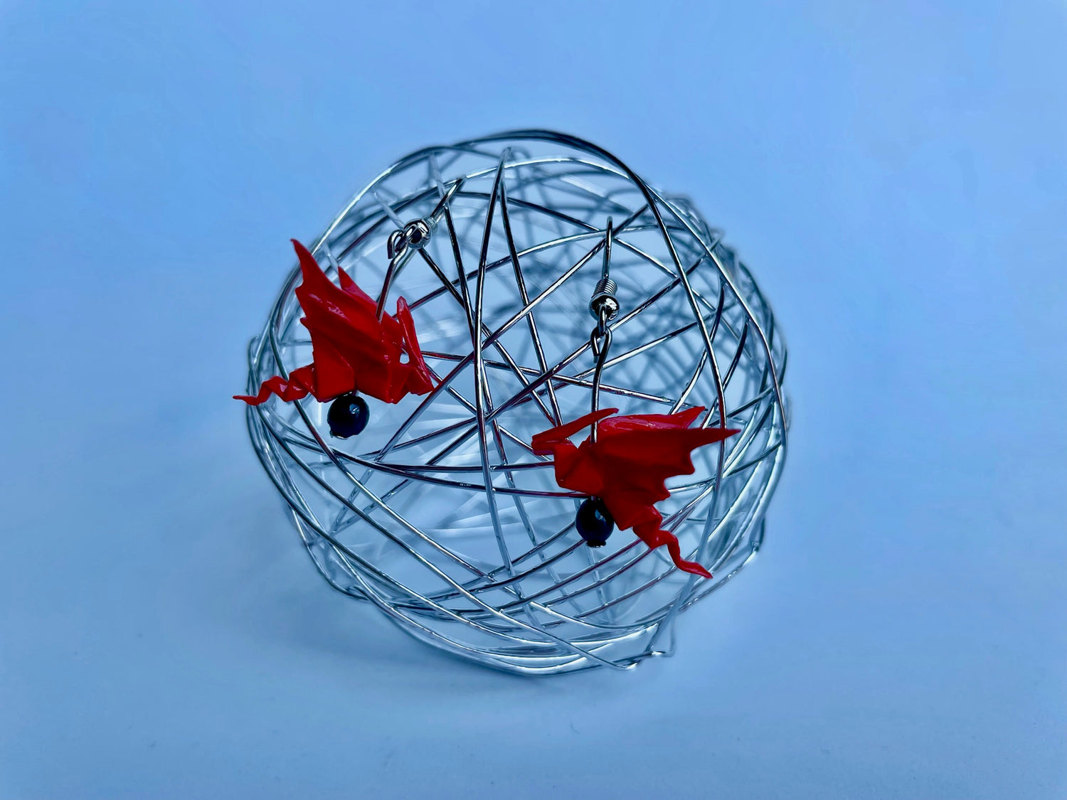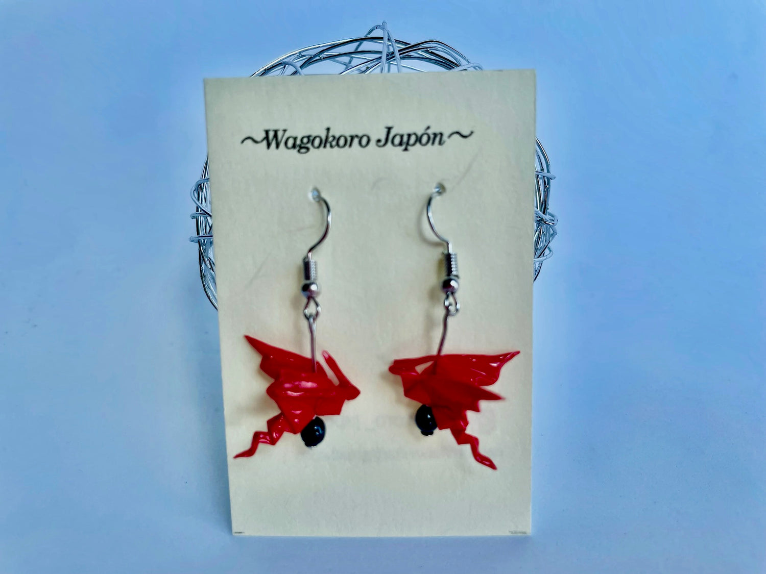 Pendientes hechos de papel japonés Origami con forma de Dragón. La obra está recubierta de un barniz y una resina para mejorar su durabilidad.