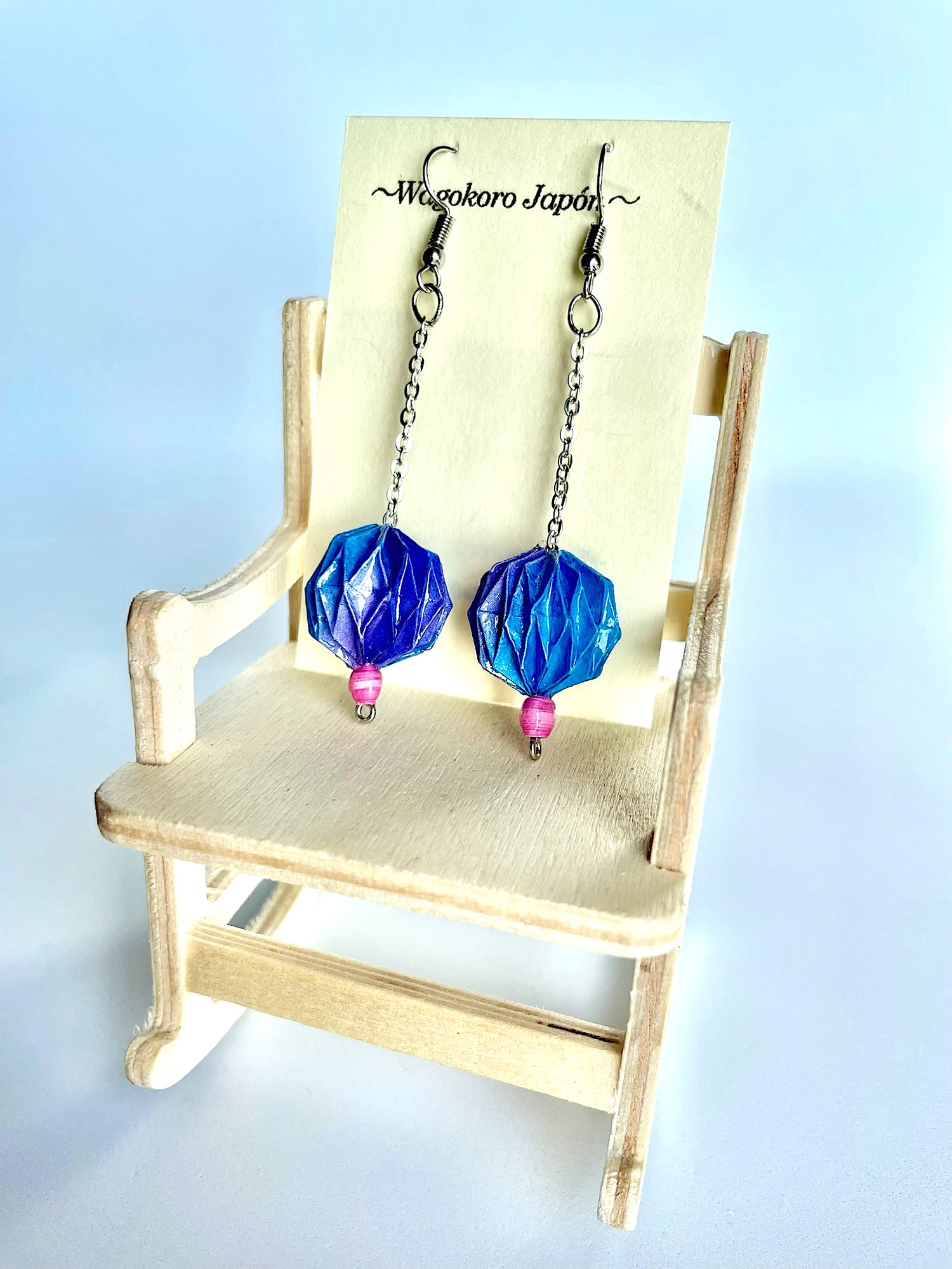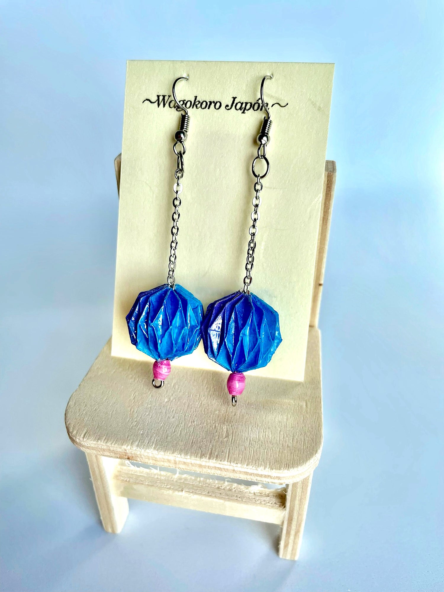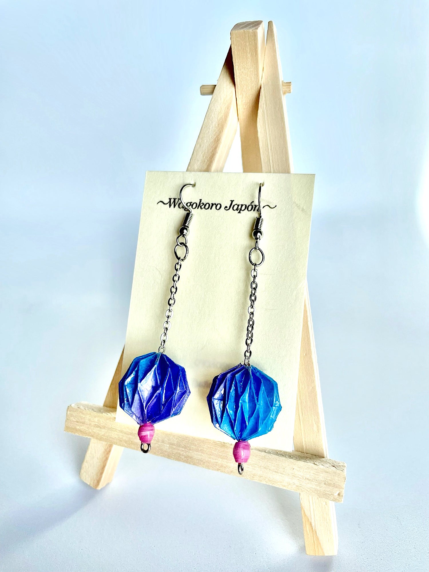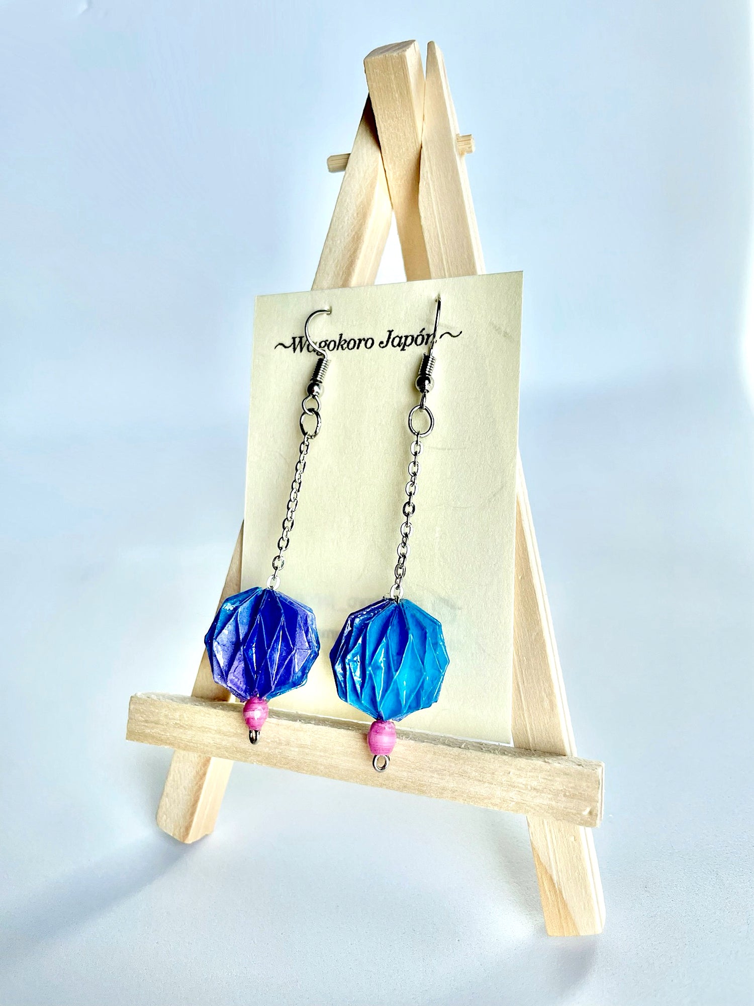 Pendientes hechos de papel japonés Origami Kusudama. La obra está recubierta de un barniz y una resina para mejorar su durabilidad.
