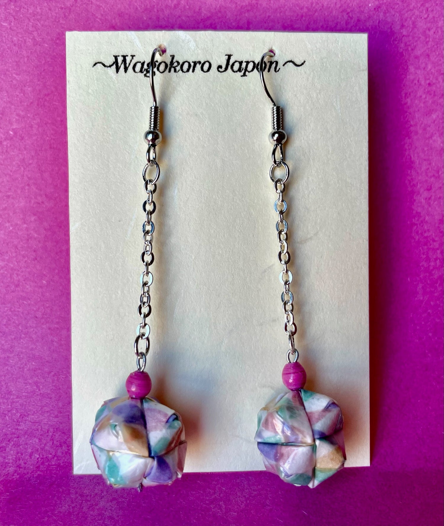 Pendientes hechos de papel japonés Origami Kusudama. La obra está recubierta de un barniz y una resina para mejorar su durabilidad.