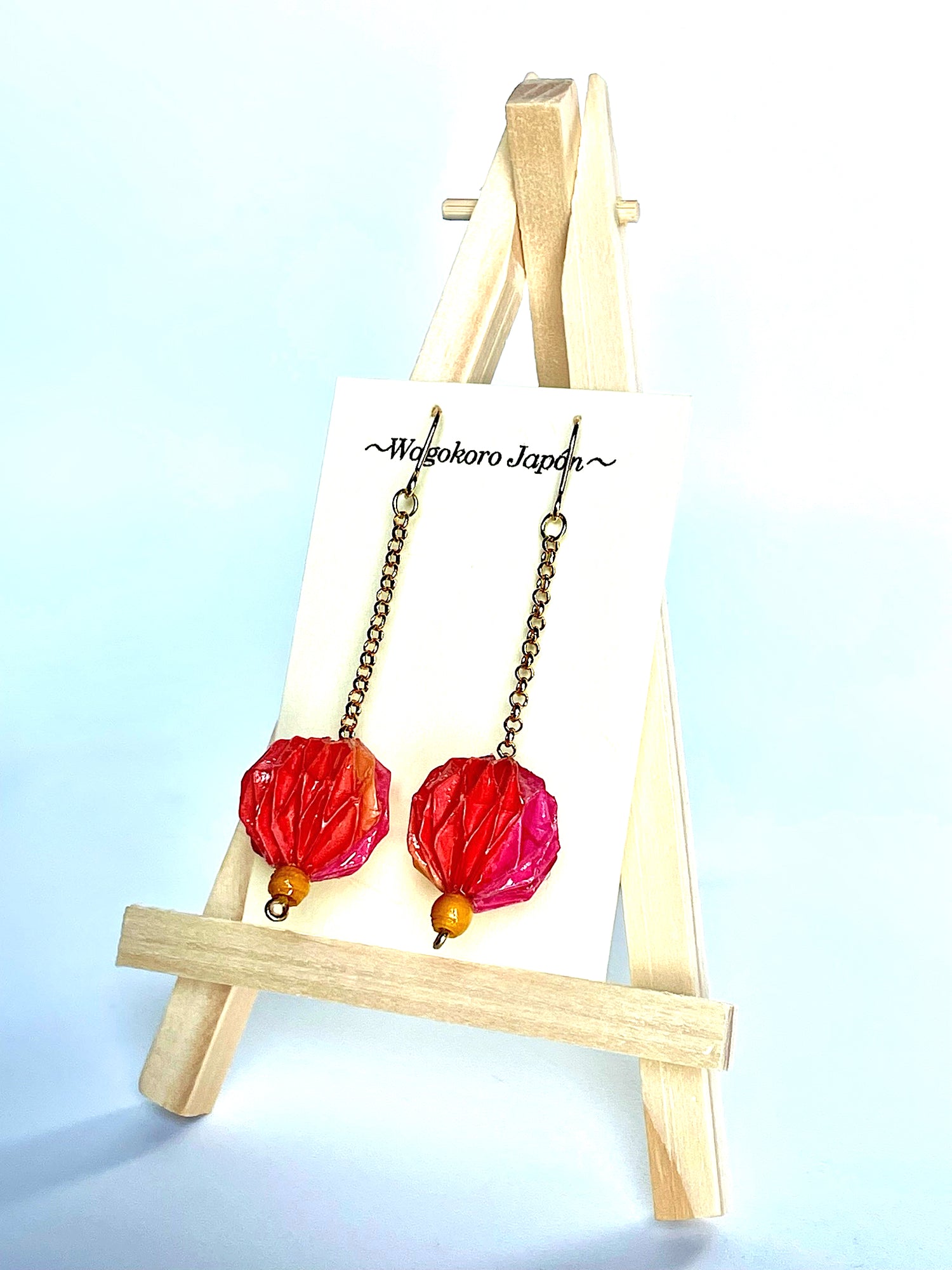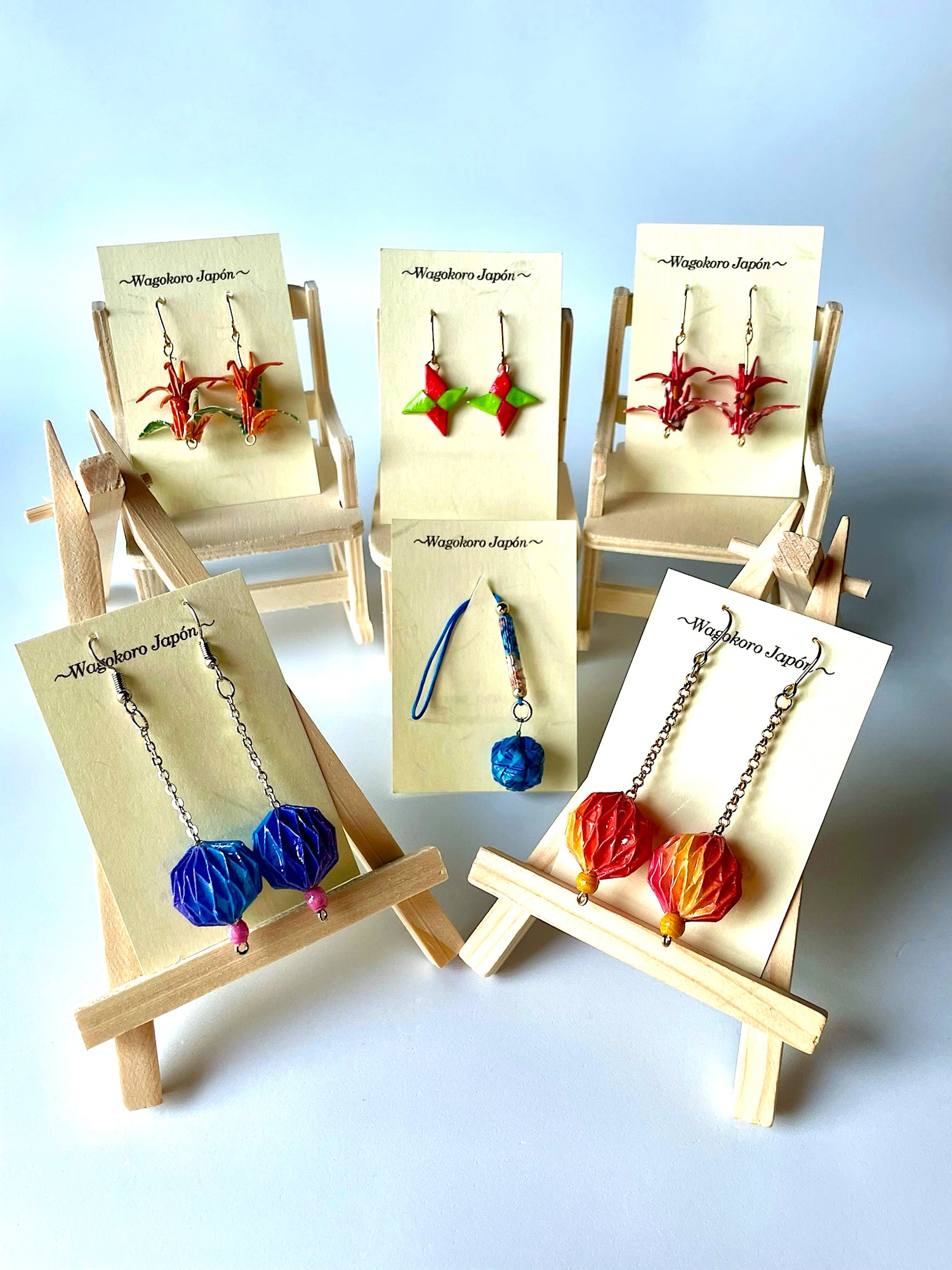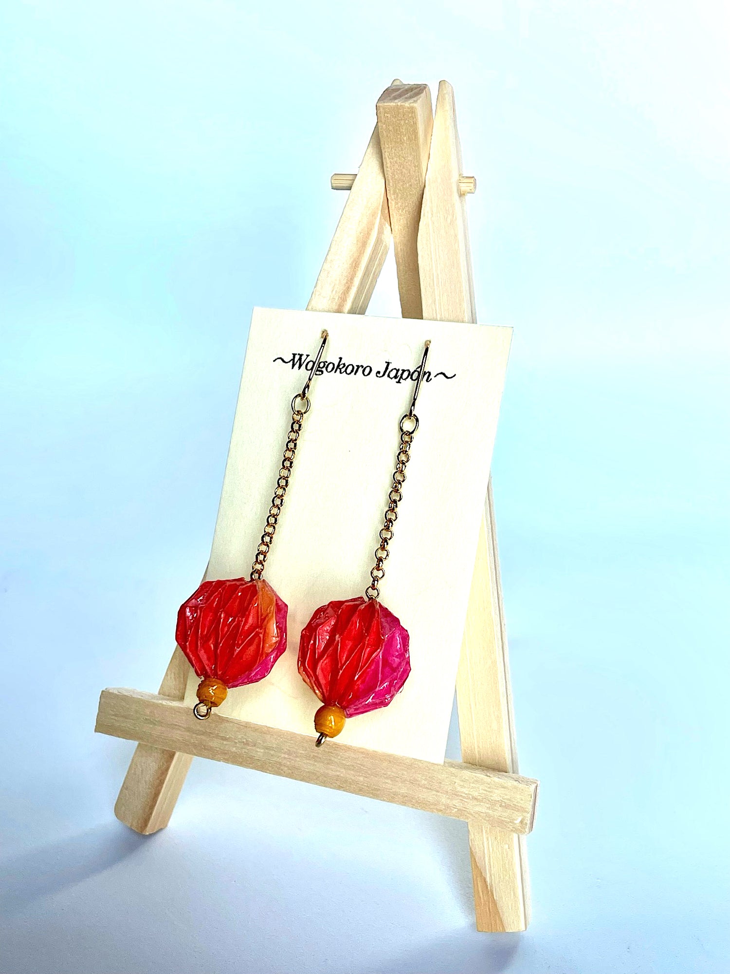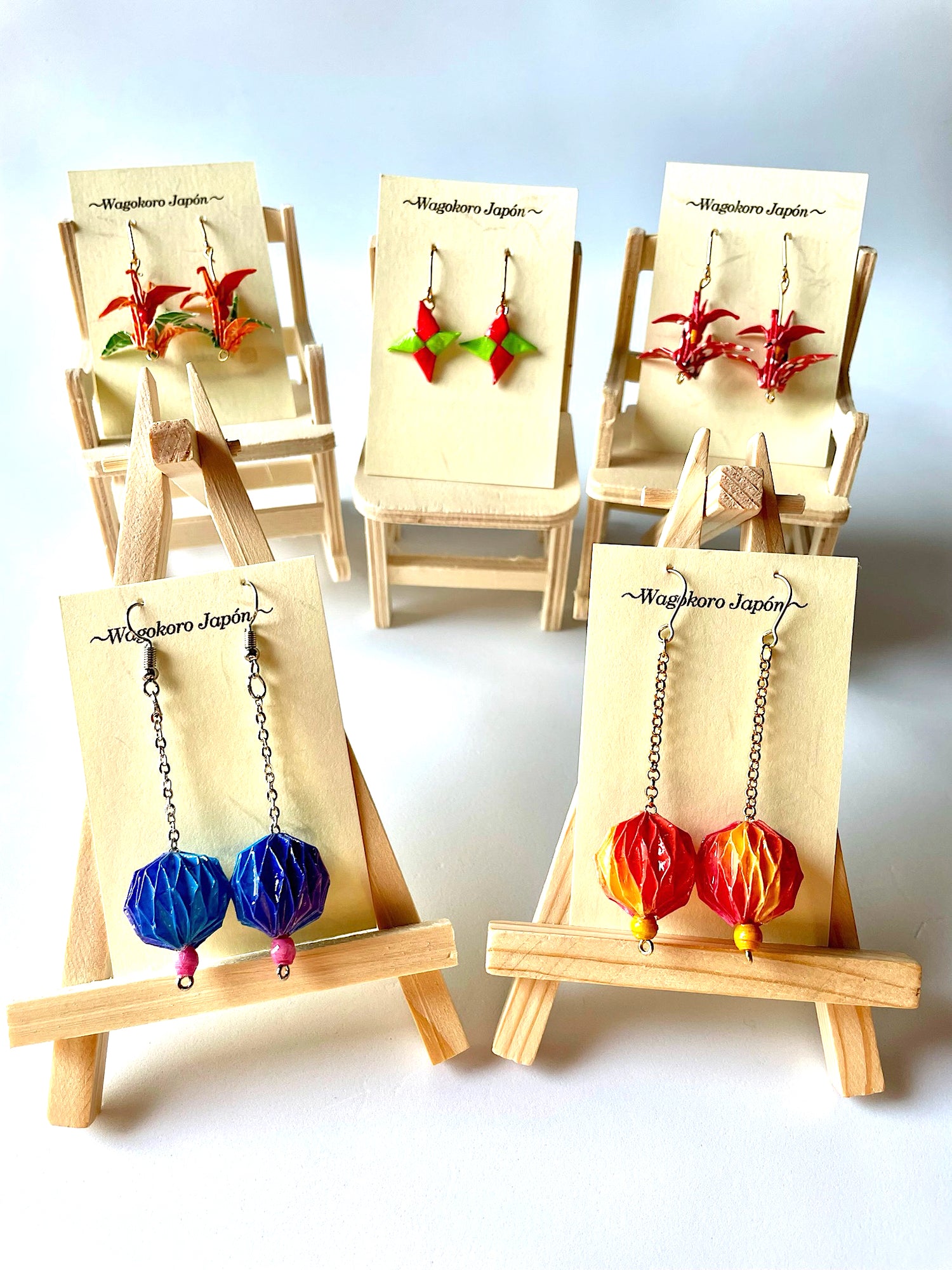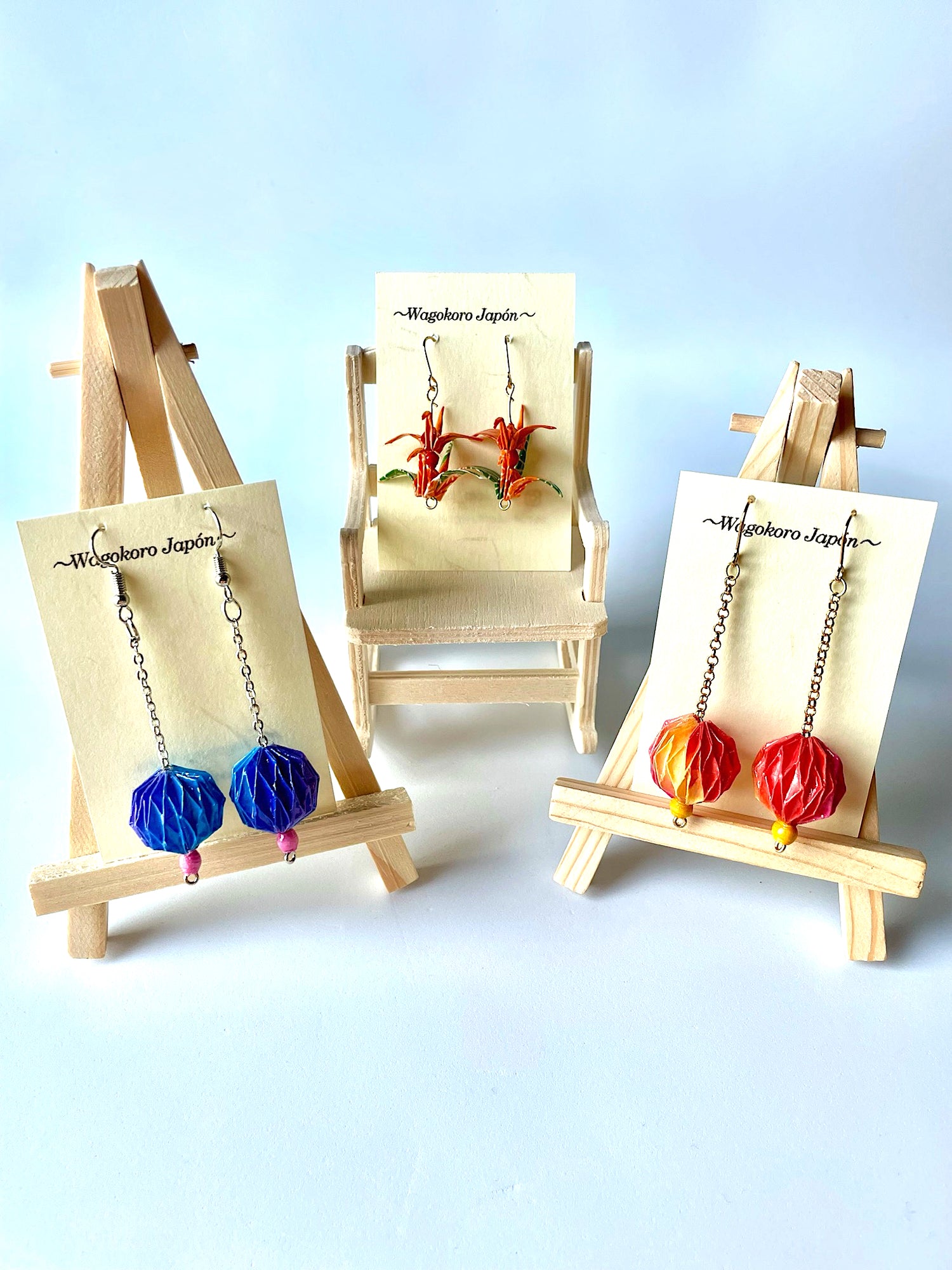 Pendientes hechos de papel japonés Origami Kusudama. La obra está recubierta de un barniz y una resina para mejorar su durabilidad.