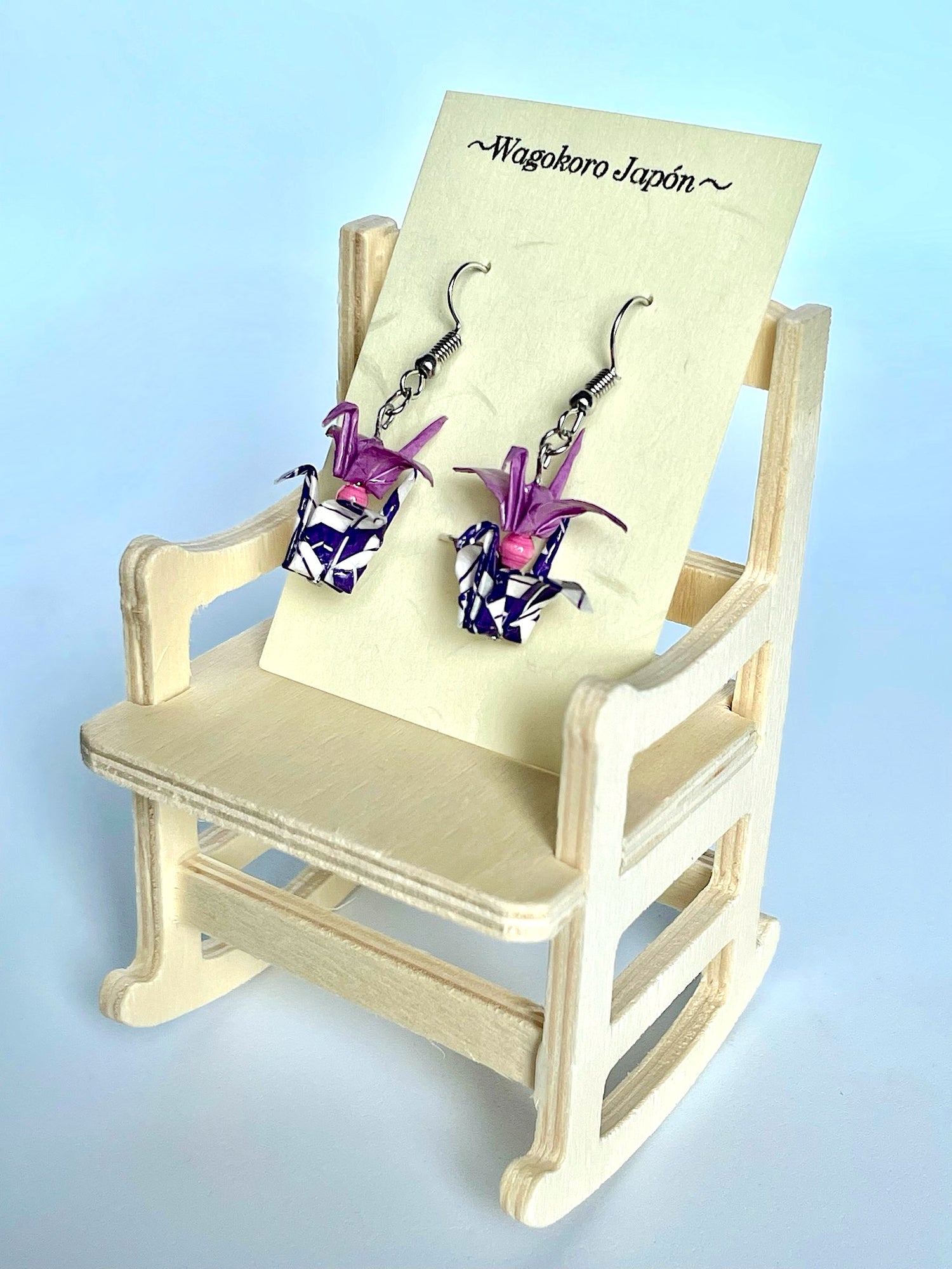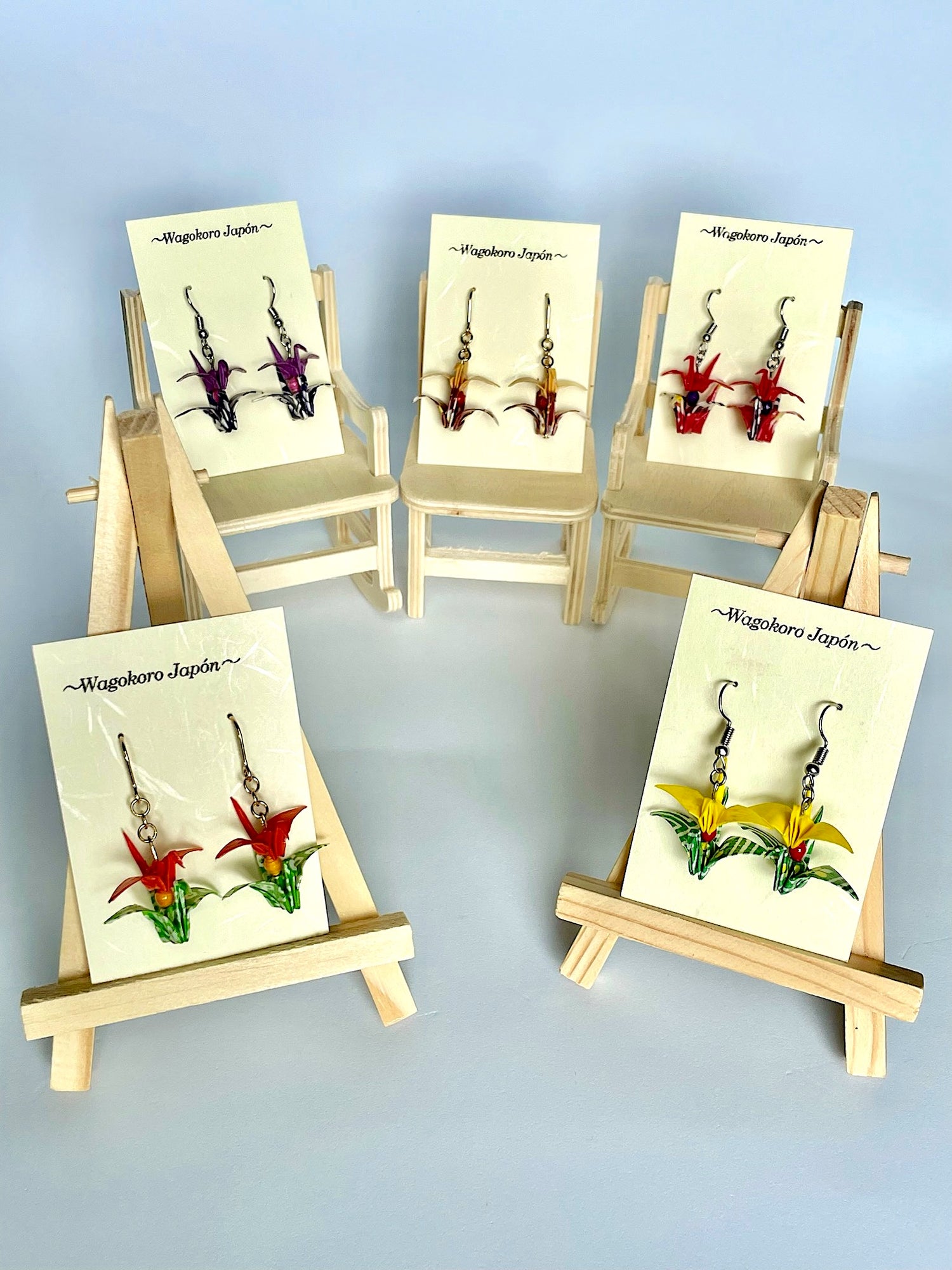 Pendientes hechos de papel japonés Origami con forma de pareja de grullas. La obra está recubierta de un barniz y una resina para mejorar su durabilidad.