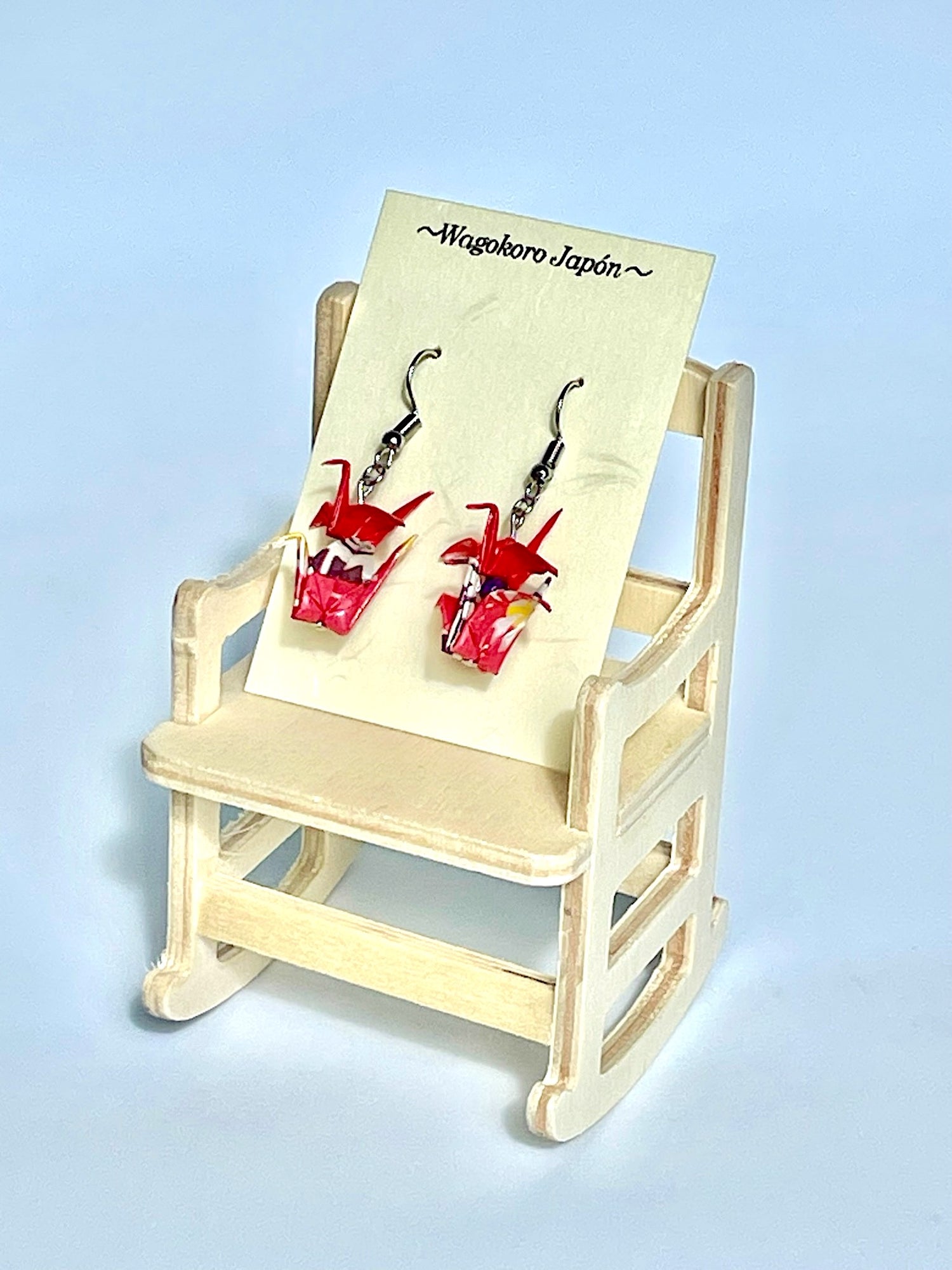 Pendientes hechos de papel japonés Origami con forma de pareja de grullas. La obra está recubierta de un barniz y una resina para mejorar su durabilidad.